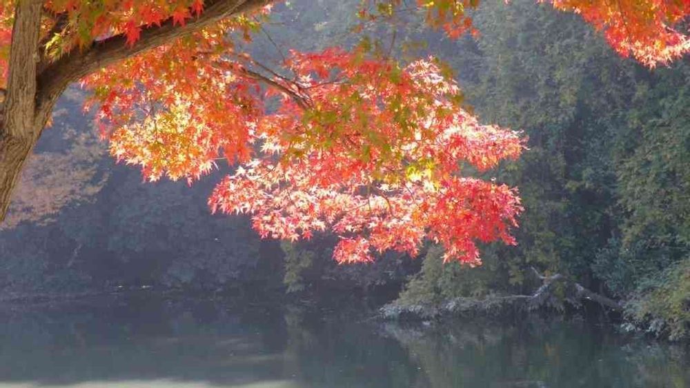 南郷公園(京都丹波亀岡 丹波亀山城内濠跡)の楓が、陽の光に輝いていました。