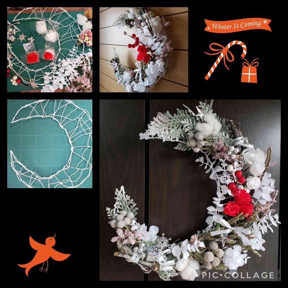 手作りドライフラワーや100均で買った材料でクレセント型の大きめなアレンジ作りました~💦