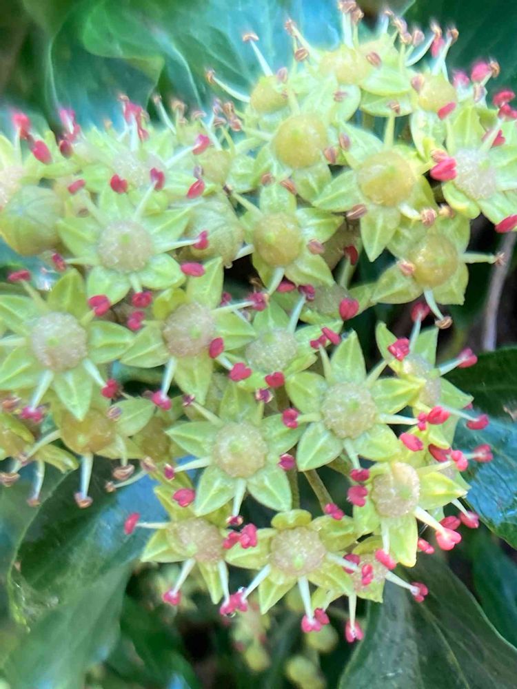 11月5日に、何気なく投稿したキヅタの花が満開状態になりました🎶😄蕊が赤いのは珍しいというコメントを頂いて、その後の観察をしていたら、少しピンク色の蕊になってます🤔