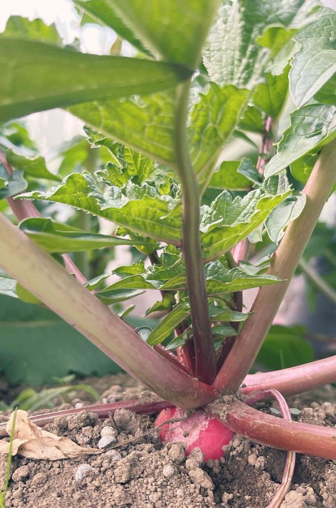土からにょっと顔を出している赤大根です。スクスクと成長しています。
