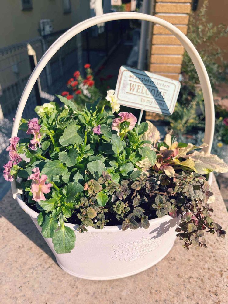 勢いで買ってしまったビオラ華あられさん、大好きだけど地植えで虫に食べられちゃうバーガンディグロウさんと、半額だったミッドナイトサンを寄せ植えてみました☺️