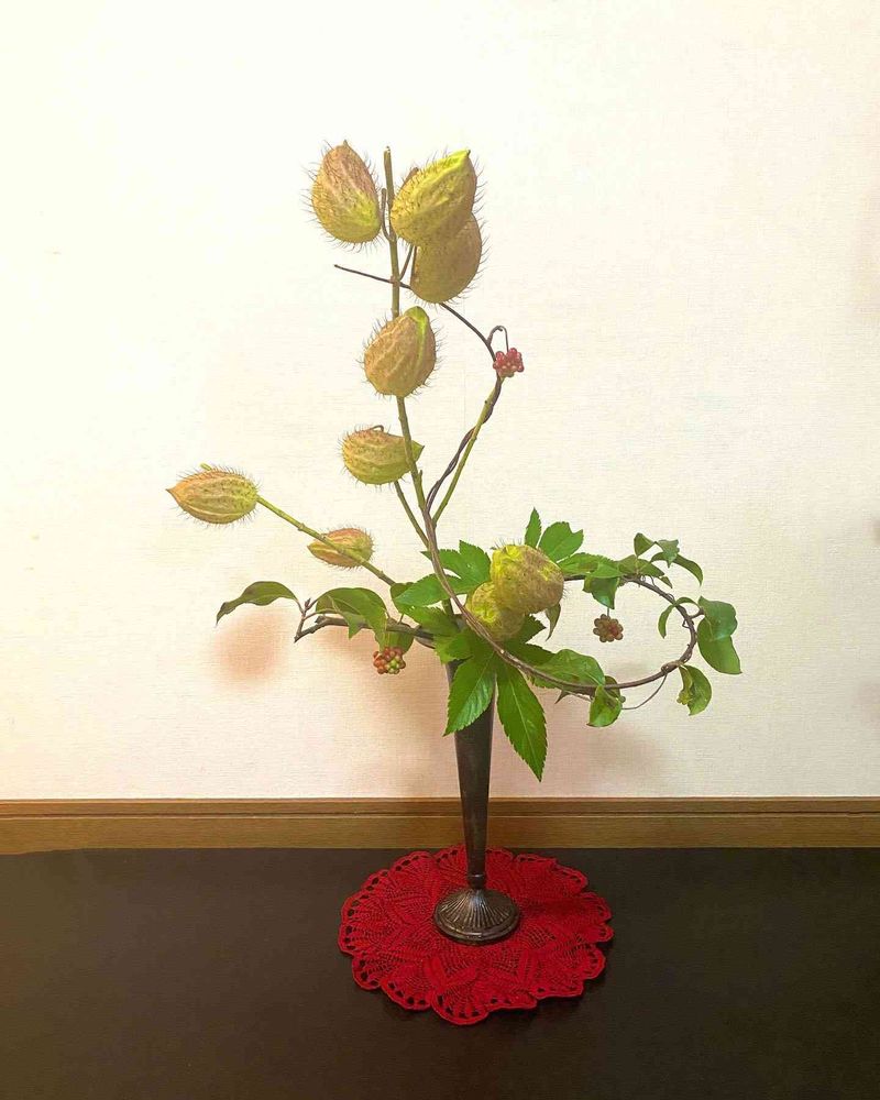 サネカズラをゲットしたのでいけてみました。今年は風船唐綿に巻きつけてみました😃