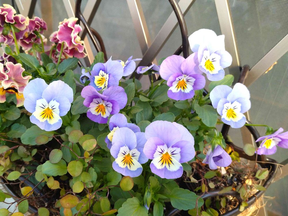 去年までは、同じ色のビオラさんを2.3株同じ鉢やハンギングに植えていましたが、今年は違う色を植えたり、同じ色にしたりしています😊