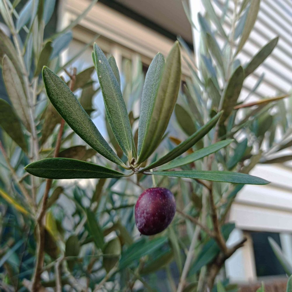 今日やっと水やりしながらパトロールしてると鉢植えのオリーブの実が色づいてるのを発見🧐
