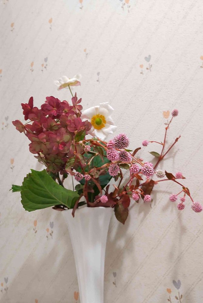 秋色になった紫陽花とポリゴナムにシュウメイギクを入れてみたら良い感じになったので🎵