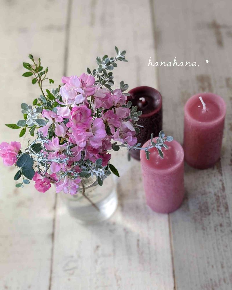 友人宅に咲いているお花を頂いたので、ピンクのキャンドルに合わせたら超ラブリーな雰囲気に💖