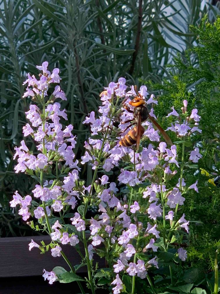 カラミンサの花に蜂が🐝寒くなり限られた花の蜜を一生懸命に集めています🌸🌿