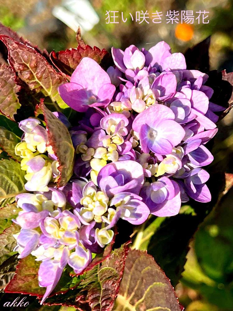 秋なのに、紫陽花が銅葉になって紫の色も鮮やかに