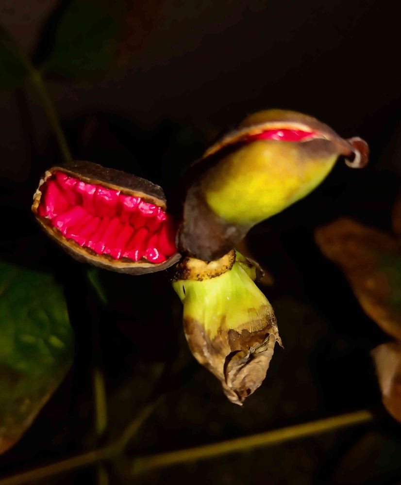 水やりの最後に山野草のコーナーで見た光景。想像していなかった姿にドン引き。山芍薬の鞘が弾けていた。