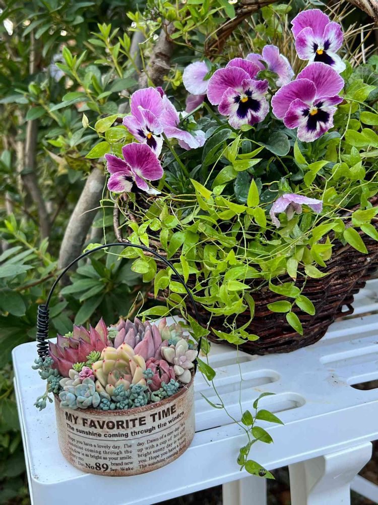 お花と、多肉ちゃん寄せ植え お似合いで、可愛い((o(。・ω・。)o))🤗💖