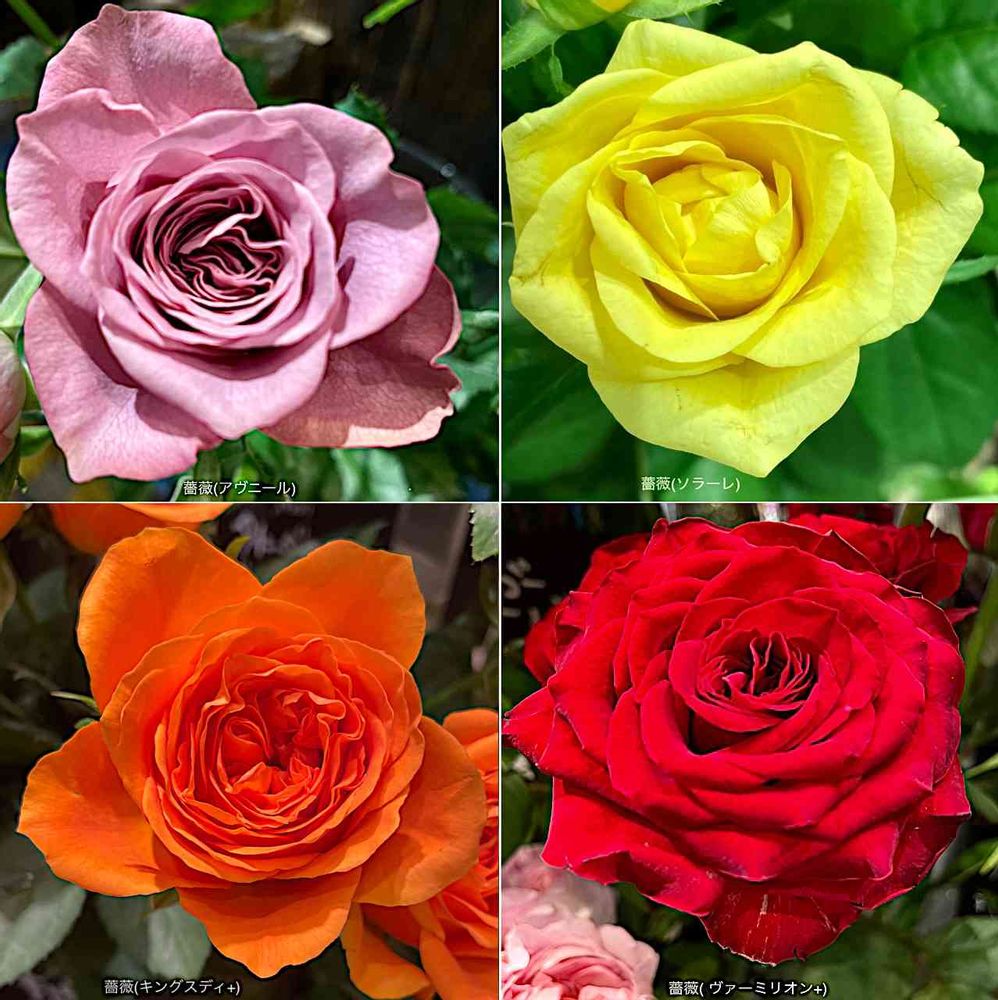 紫系x1、黄系x1、橙系x1、赤系x1のバラ、4つ。