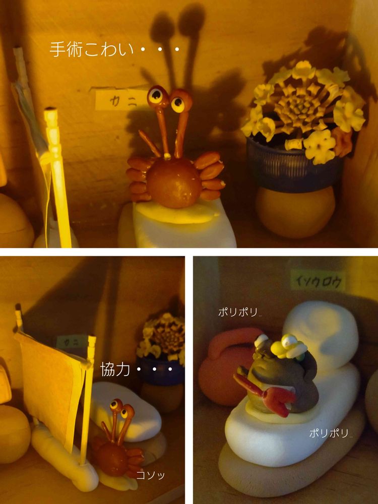 こっそりと居候くんの所へ行くカニくん。カワイイ。手術こわいよね😣