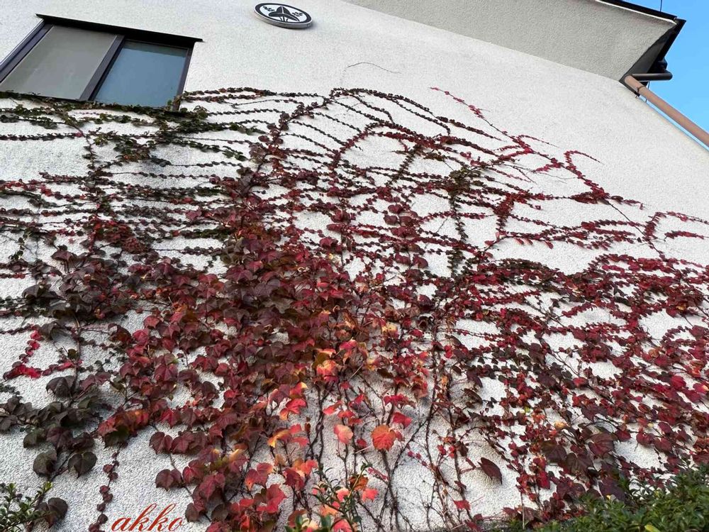 白壁に自然のアート紅葉きれいですね。落葉したら蔦を剥がすのでしょうかね😄