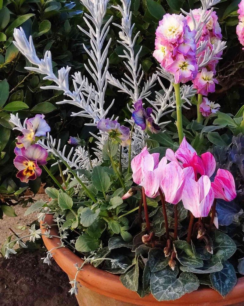 春咲小紅さんのガーデンシクラメン,ビオラ,八重咲きストックの投稿画像
