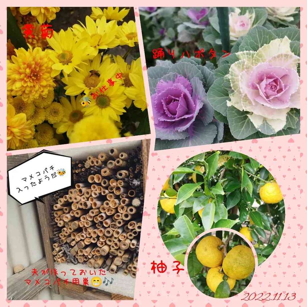 夫が庭で働いてくれるマメコバチに来てほしいと近くに生えている竹を切って干しておいて夏頃作っておいた巣にマメコバチが入ってくれたみたい🐝