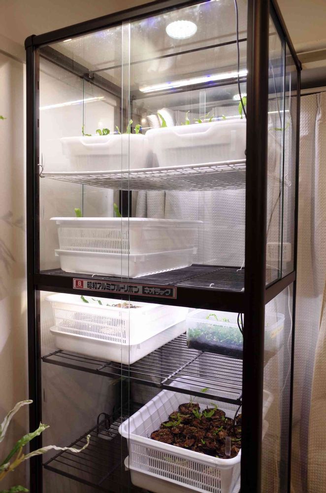 すごい!ガラスですか? なんか地震考えると怖くて置けないんですよね💦だから、簡易ビニール温室棚で妥協するという😅