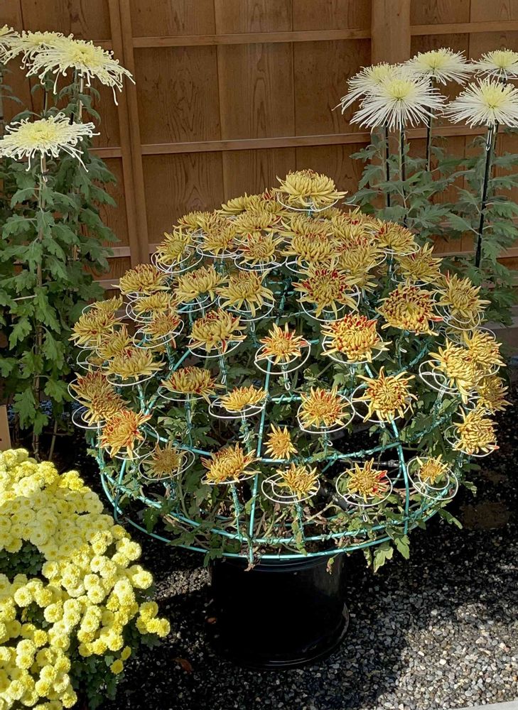 菊の千輪仕立てあるいは千輪作りとは、1本の菊苗に摘心を行って、側枝の数を増やして、数百の茎を育て立ち上げて、株全体を直径3〜4mほどの半球状に仕立て、各茎は一輪咲きにして数百輪の花を同時に咲かせる作り方だそうです。🌼🌼🌼