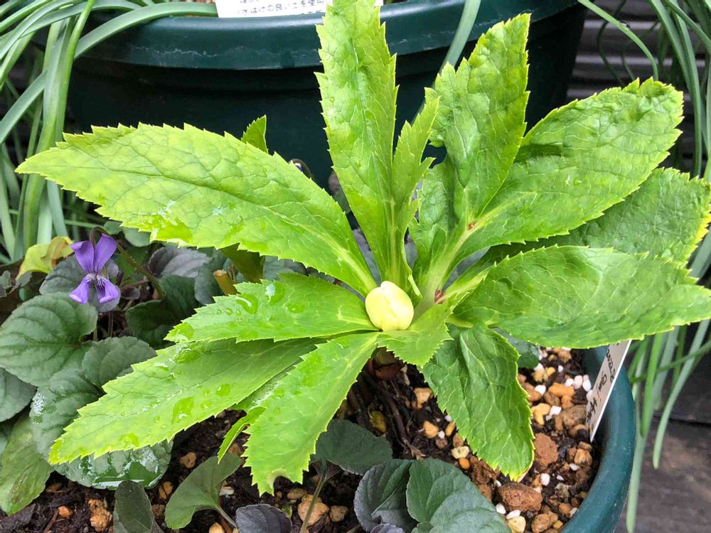 クリスマスローズの葉の真ん中に、白い蕾が見えます。