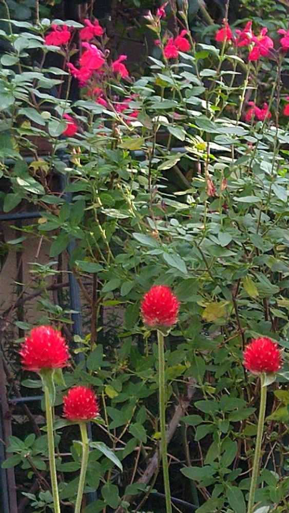 真っ赤なチェリーセージと千日紅と共に 本当に良い日!!❣️