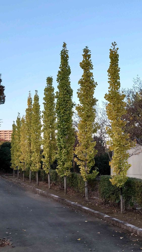 遠くに何やらニョキニョキと怪しげに林立する黄色い木々が😱 近づいてみるとクール&スマートなイチョウでした😀(散策した農業関連施設にて)