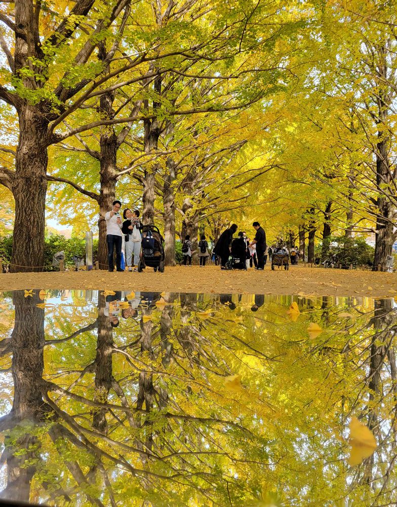 地面におかれた巨大鏡にイチョウ並木が映り幻想的な画像が撮れます📷️