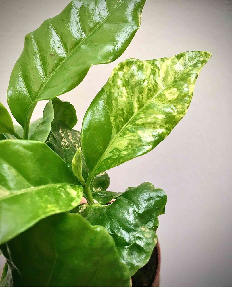 どこでも見かけるのであまり気に留めていなかったコーヒーの木。よく見れば1本だけ斑入り!?まだ双葉が残る実生なので今後の成長が楽しみ。
