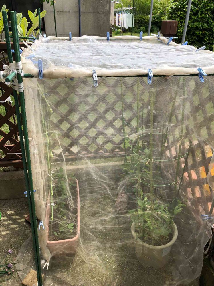ハモグリバエにやられないように、虫除け網とイボ竹で簡易ハウスを作ってみました。