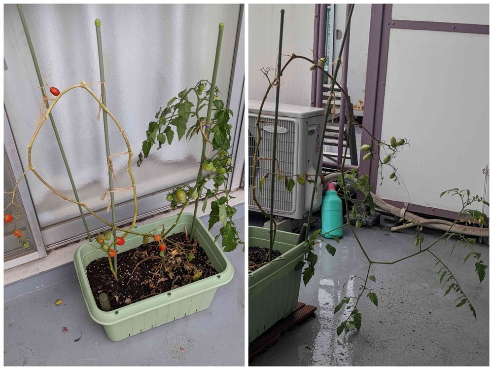 以前台風の中バルコニーに出しっぽなしにしてすごい格好になってしまったミニトマトさん(右)