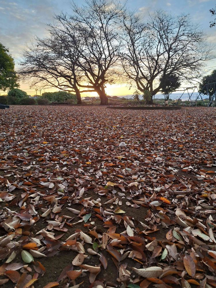 夜中の少しの雨と風で、公園、⛩️が落ち葉🍂だらけに❗