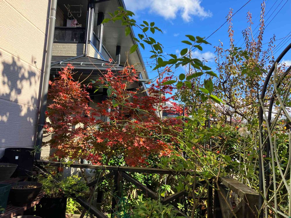 毎年重なったり他の方向に向いたりする枝を剪定して、今年ようやくこれまでのように茶色っぽい色でない紅葉らしい赤色に🍁
