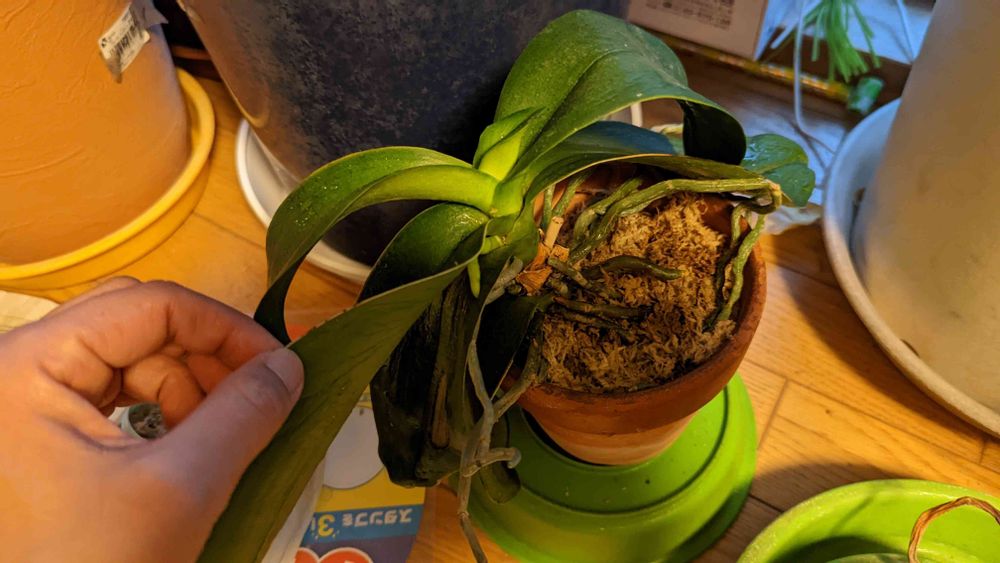 根腐れしたので胴切りして植え替えたミディ胡蝶蘭から、新しい花芽が出ました🌱とりあえず元気みたいで、少しだけ安心しました😊