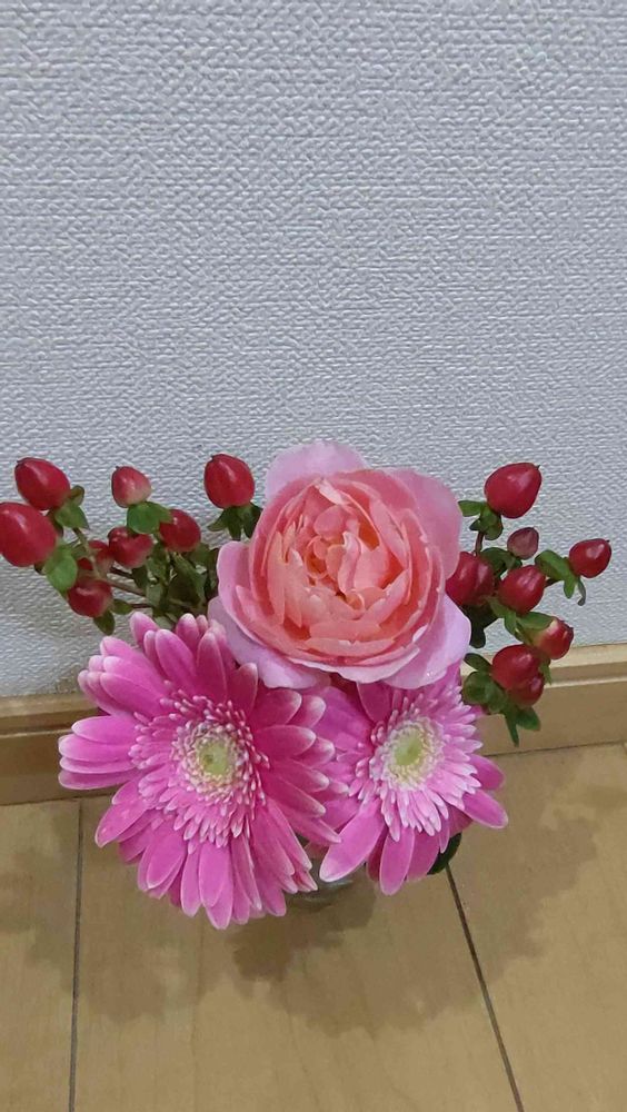 買ってきた切り花のガーベラに、庭で咲いてる薔薇を1輪さしてみました。カーベラも可愛くて大好きな花です(◕ᴗ◕✿)