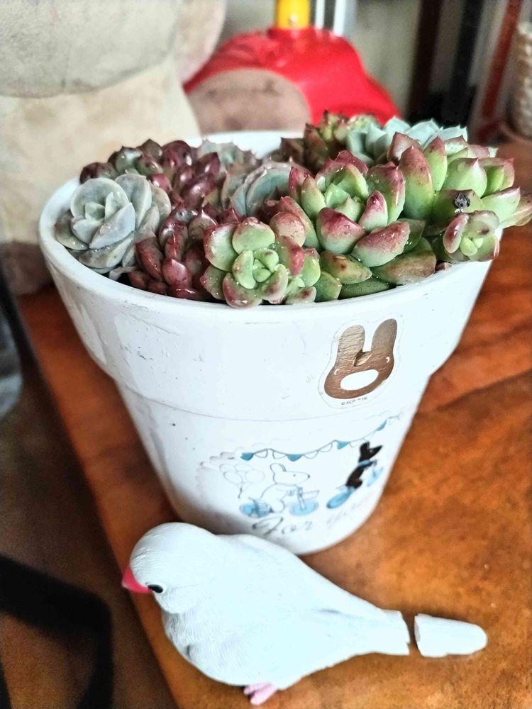 ダイソーのエケさんの寄せ植えとミニラちゃんに壊された文鳥さんです...💦