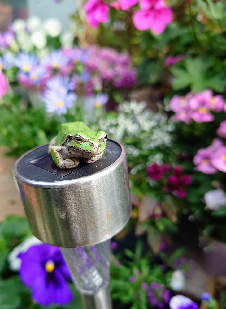我が家に住み着いている ニホンアマガエルでソーラーライトの上で充電しているように見えます😅🤭 警戒心が無くレンズを近くに向けても 逃げようとしません😃 苦手な方ごめんなさいm(_ _;)m