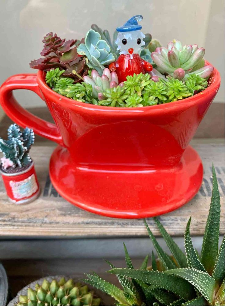 長いこと家のすみに眠っていたコーヒードリッパーが赤だし、で、ミニ寄せ植え。早いけどクリスマスな感じ?