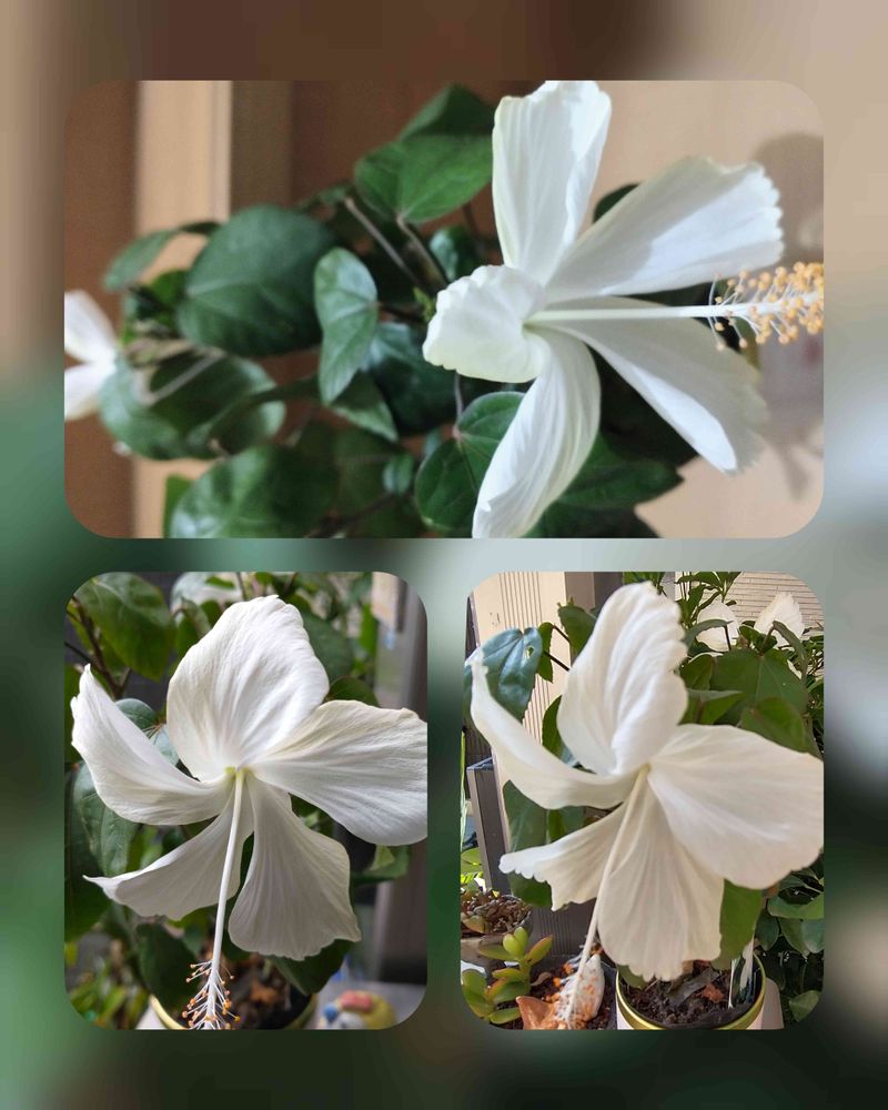ミニ🤍ハイビスカスの白(常夏の香り) 珍しく一度に2輪咲いて、もう、5日目です