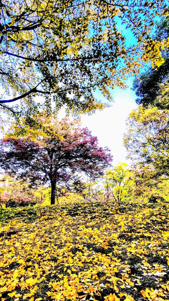イチョウの落葉で丘が黄色に染められています。