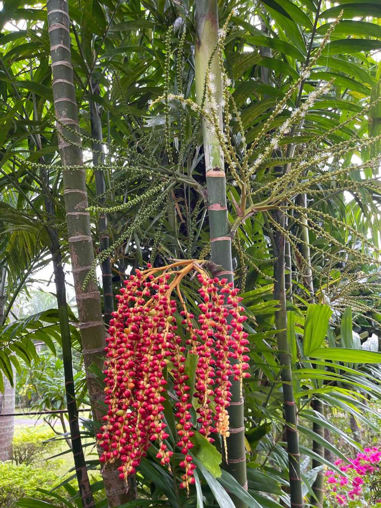 沖縄の植物園でマッカーサーパームが赤い実と白い花をつけていました😍
