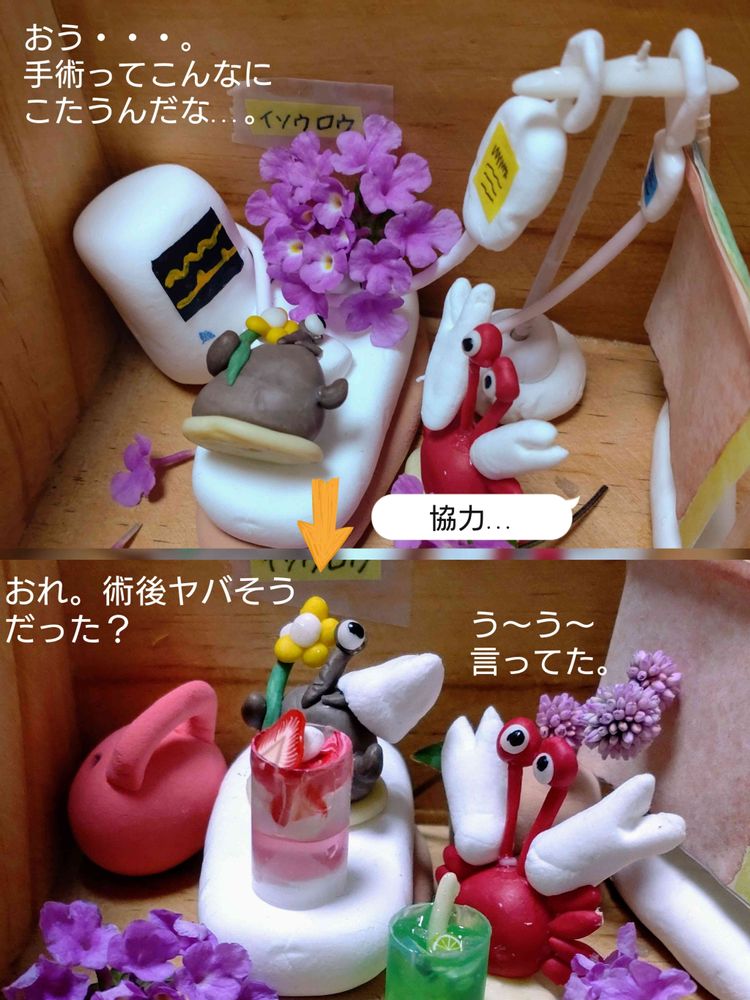 カニくんが居候くんの周りに協力の花、ランタナを添えました。