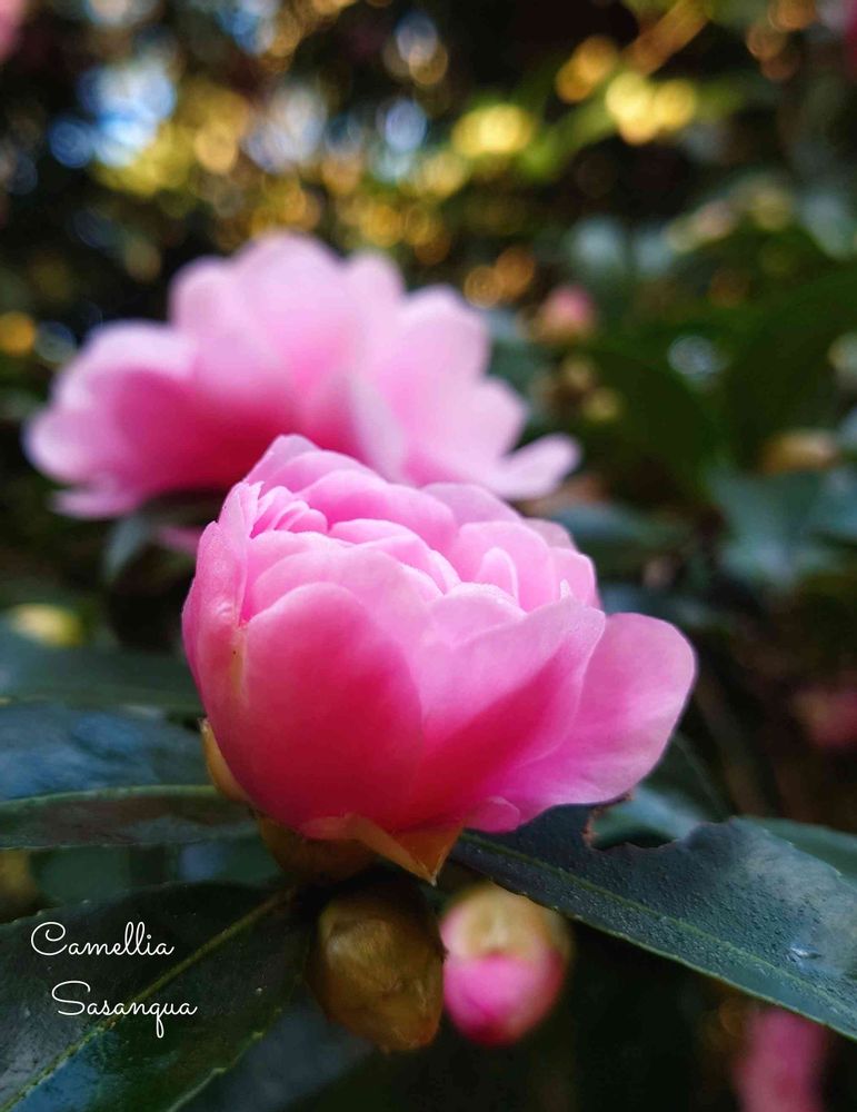 キラキラ輝く朝日を背に、ふんわりふわり、山茶花が開き出していました