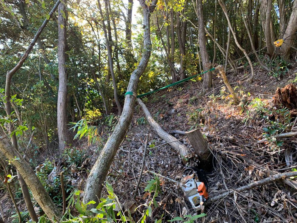 さん😀そう、カールくん🐕の犬舎の上です😀チルホール でカールくんのほうに倒れないよう引っ張りながら伐採です😀例年、欲張って太いのを伐採してましたが、今年はホームセンターで販売してる程度にしておきました😅自宅消費だから5、6本くらい出来ればいいです😀