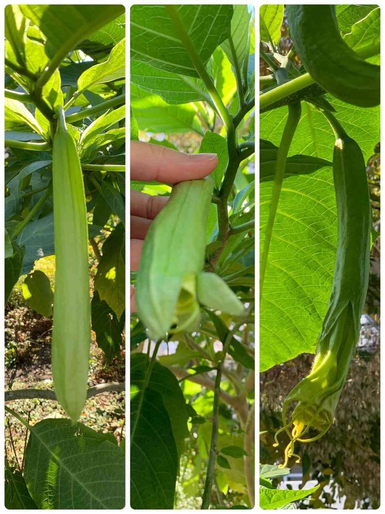 こんにちは👋😃今朝エンジェルトランペットの種?🙄空豆?🤔と出した投稿ごめんなさい。リハビリの先生と歩行訓練で見て来たら😲蕾です😂左から→口あけてるので😉これから咲くのですね🙏💦💦蕾でした😂🤣凄い一週間で?もうまた満開見られるかしら💕♪