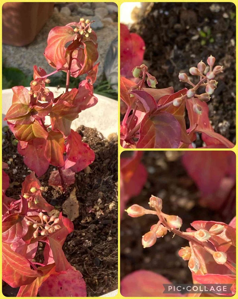 葉っぱが赤く紅葉したジュズサンゴに蕾がいっぱい