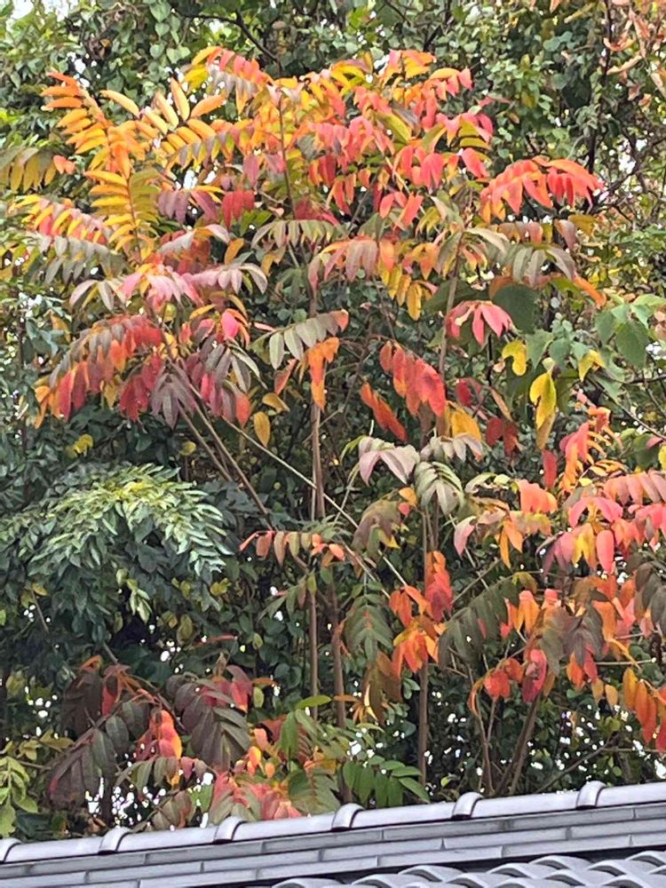 お寺らさんの屋根越しに見るハゼの、華やぎ素敵だなぁ~🎵