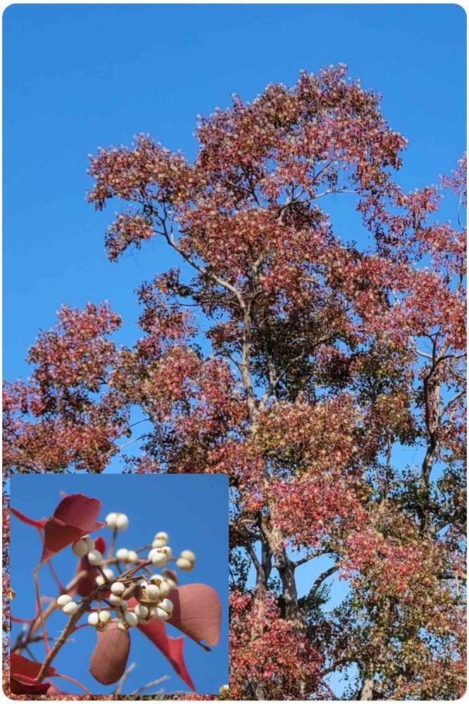 青空をバックに、紅葉したナンキンハゼの大木と白い実が素敵でした。