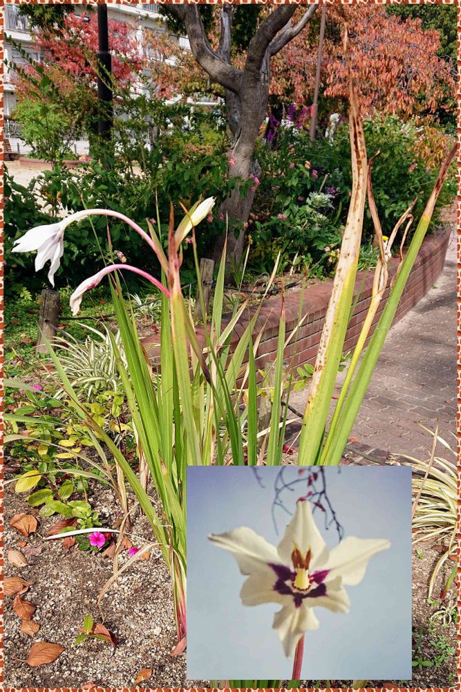 細く垂れ下がった茎の先に白いお花の付け根に栗色(時折オレンジ色)の斑紋があるのに、花壇の方を向いてお花を上手く撮れないからスマホ📱画面を回転させ思いっきり手だけ伸ばして撮ってみました(((^_^;)