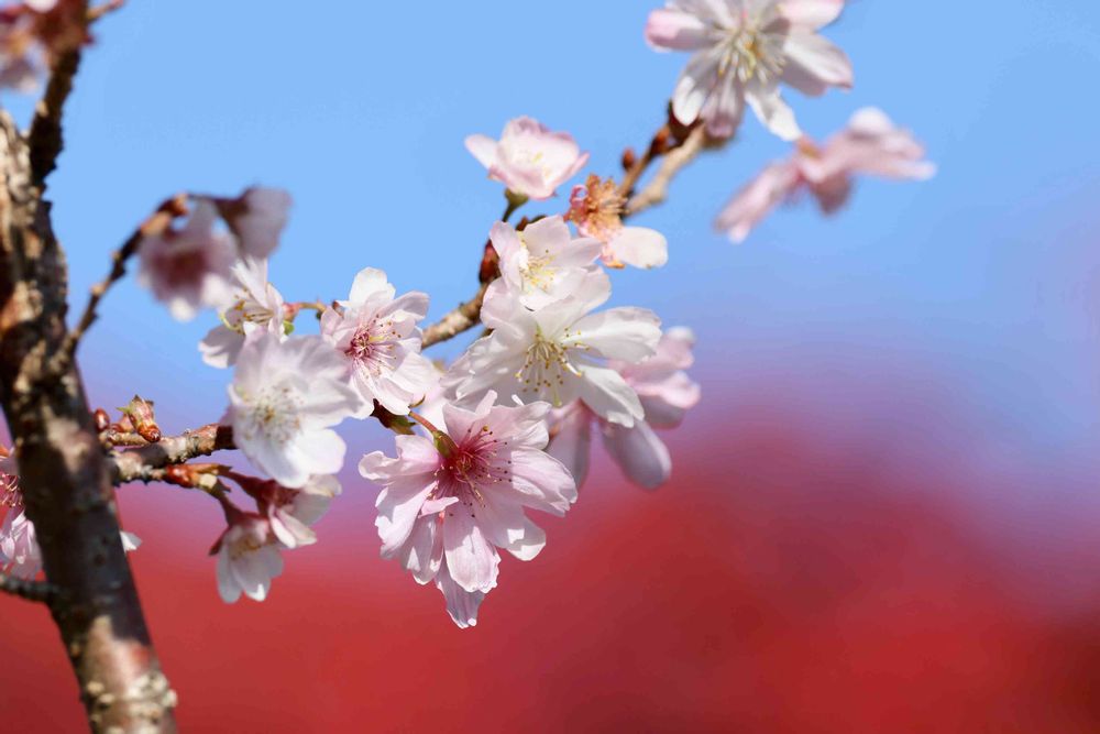 モミジの紅と青空の青を背景に咲く十月桜🌸