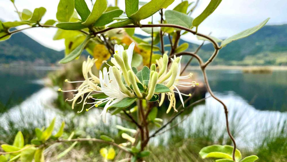 スイカズラと浮き島と池を囲む山々