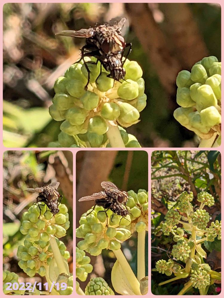このハエらしき虫は、卵をヤツデに産み付け、育てようとしてるのかもと想像してしまいました。😄