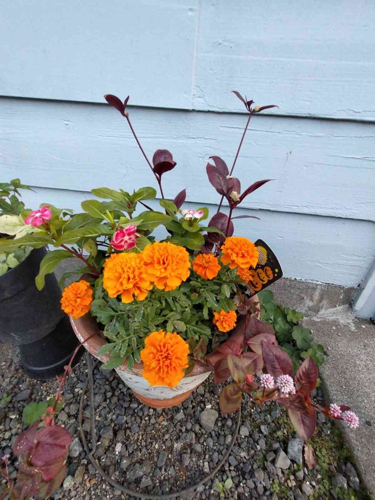 マリーゴールドとアルテルナンテラ・レッドフラッシュとニチニチソウとこぼれ種で生えてきたヒメツルソバ